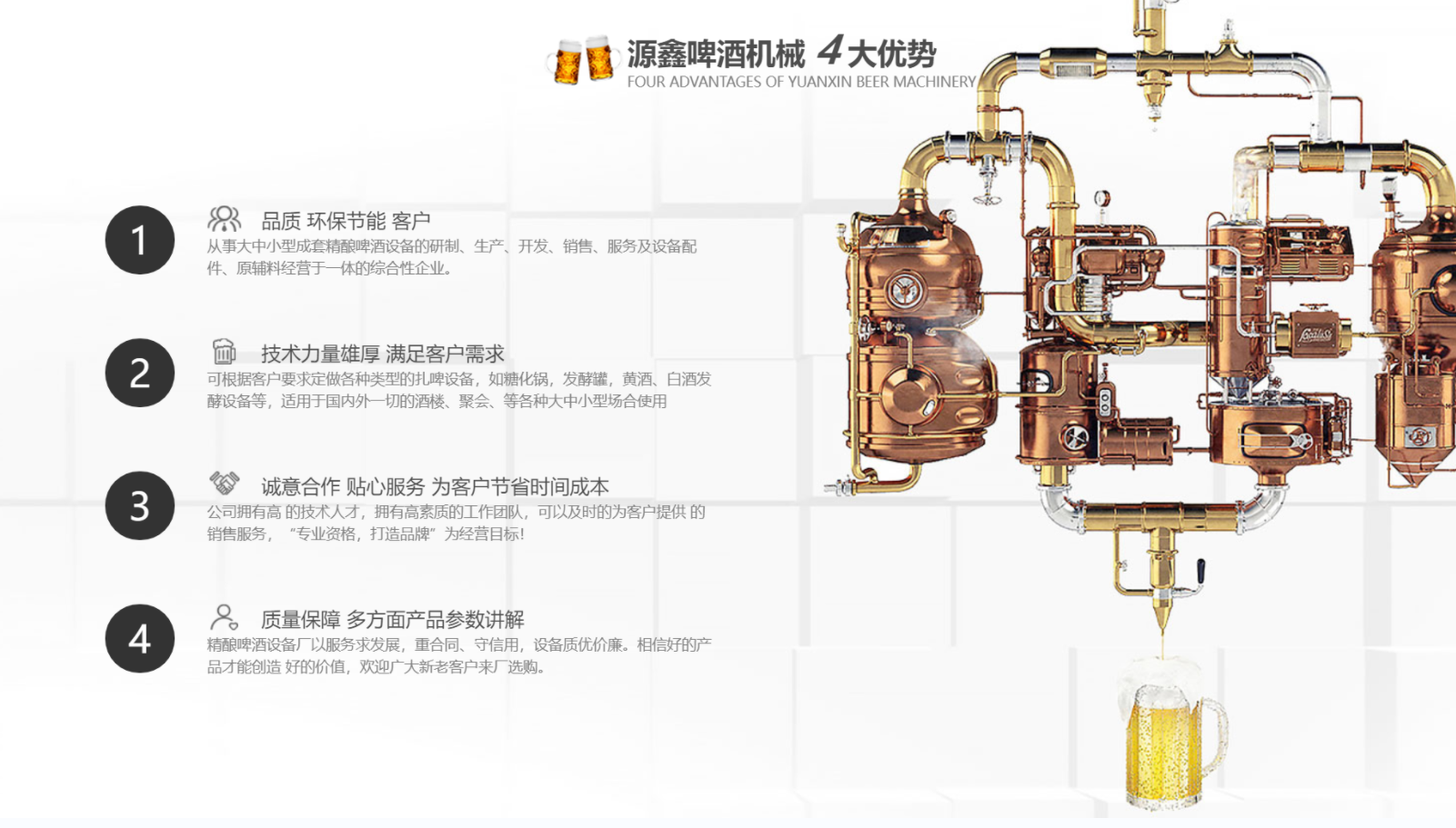 南陽市源鑫啤酒機械設(shè)備有限公司位于歷史文化名城一-南陽,從事大中小型成套啤酒、白酒自釀設(shè)備的研制、生產(chǎn)、開發(fā)、銷售、服務(wù)及設(shè)備配件、原輔料經(jīng)營于一體的綜合性企業(yè)。公司可根據(jù)客戶要求定做各種類型的扎啤設(shè)備,如糖化鍋,發(fā)酵罐,黃酒、白酒發(fā)酵設(shè)備等,適用于國內(nèi)外一切的酒樓、餐廳、家庭.聚會、酒吧等各種大、中、小型場合使用。公司擁有技術(shù)人才,擁有高素質(zhì)的工作團隊,可以及時的為客戶提供**的銷售服務(wù)。公司以“專業(yè)資格,打造品牌”為經(jīng)營目標(biāo),“卓越質(zhì)量,信賴價格”為經(jīng)營宗旨,以質(zhì)量求生存,以服務(wù)求發(fā)展,重合同、守信用,設(shè)備質(zhì)優(yōu)價廉。相信好的產(chǎn)品才能創(chuàng)造 好的價值,歡迎廣大新老客戶來廠選購。...